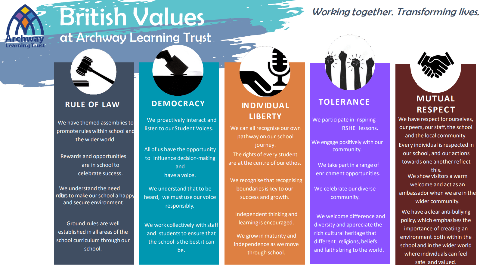 We place a strong emphasis on the development of students’ spiritual, moral, social, and cultural (SMSC) understanding, alongside the promotion of British Values. These include: Democracy, The Rule of Law, Individual Liberty, Mutual Respect and Tolerance of Different Faiths and Beliefs. Through these principles, students learn to navigate the world with empathy and confidence, equipped to thrive as active, informed, and compassionate citizens.